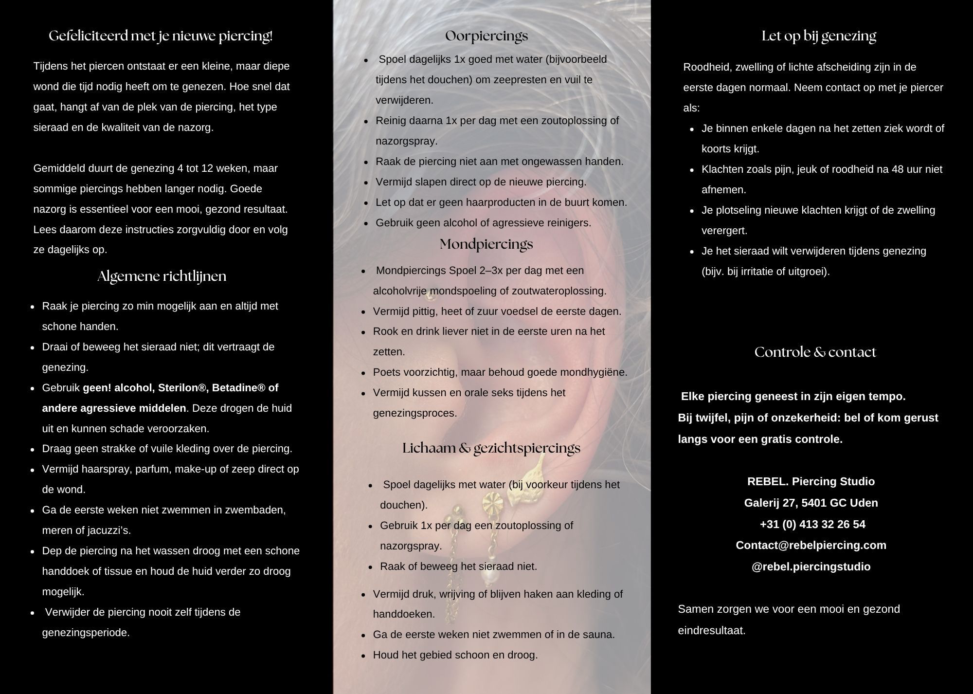 Wees vooral niet bang om terug te komen en even binnen te lopen, het checken of de genezing goed gaat is helemaal gratis. Het belangrijkste is dat je luistert naar je eigen lichaam. Vertrouw je het niet, of voelt de genezing anders dan bij eerdere piercings? Trek dan altijd aan de bel, dan helpen we je verder. Ook als je de piercing niet bij ons hebt gezet, ben je altijd welkom.